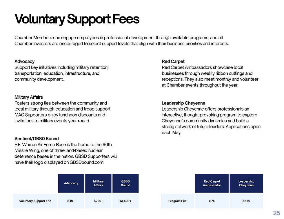 Contact the Greater Cheyenne Chamber of Commerce at (307) 638-3388 to explore all the offerings and find an investment level that aligns with your needs.